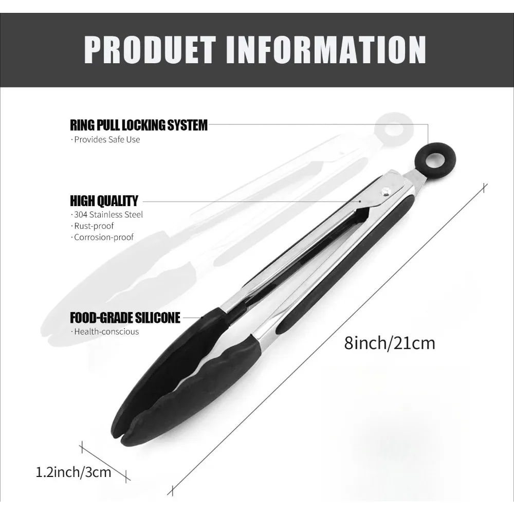 8" Food Tongs Cooking Tongs with Stainless Steel Handles and Heat Resistant Heavy Duty Rubber Heads for Grilling, Salads, Etc.