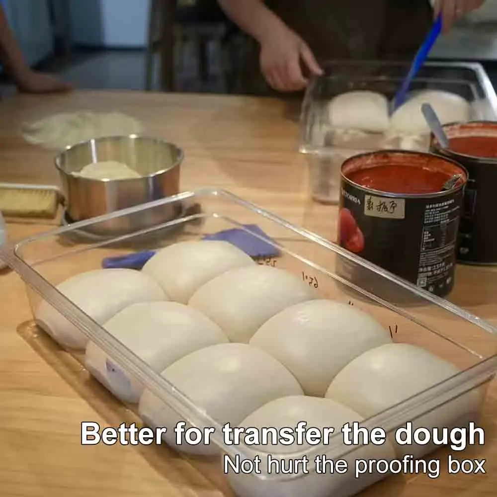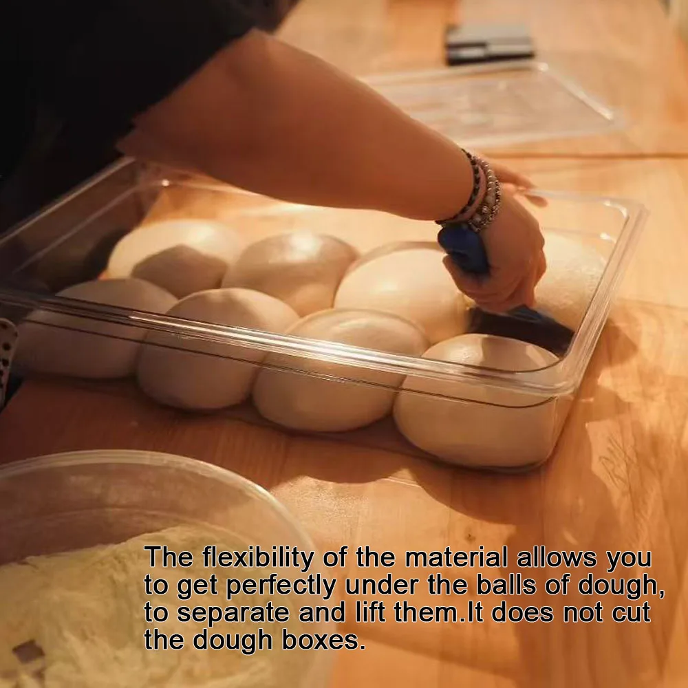 The flexibility of the material allows you to get perfectly under the balls of dough, to separate and lift them.It does not cut the dough boxes.